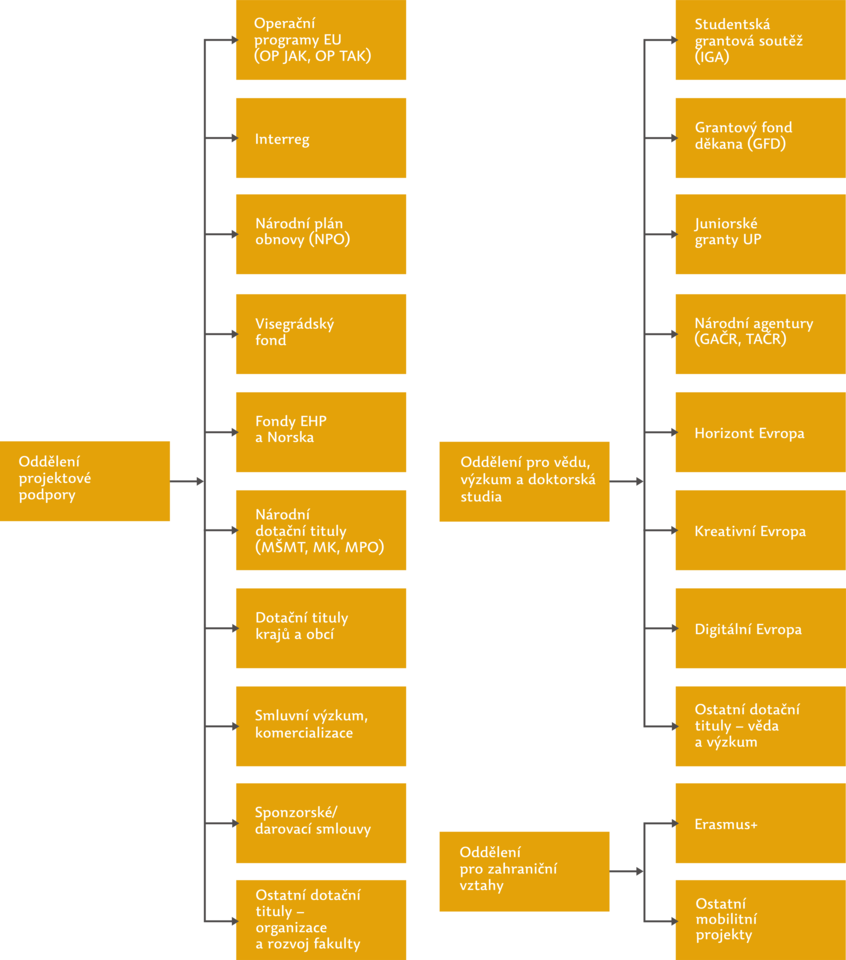Za podávání žádostí do dotačních programů a za související agendu jsou na naší fakultě odpovědná příslušná pracoviště dle schématu níže.