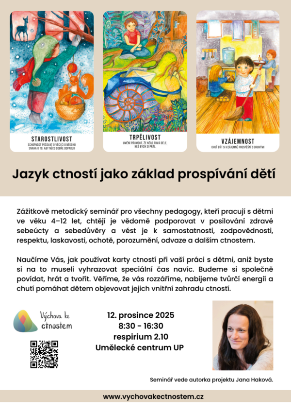 Nabízíme další kurz Centra inovací ve vzdělávání PdF UP, tentokrát na rozvíjení vnitřních kvalit osobnosti dítěte. Zážitkově metodický seminář s MgA. Janou Hakovou, zakladatelkou oceňovaného projektu Výchova ke ctnostem, nabídne inspiraci, jak podporovat u dětí i studentů zdravou sebeúctu, sebedůvěru a další ctnosti – od respektu a laskavosti po zodpovědnost a odvahu.