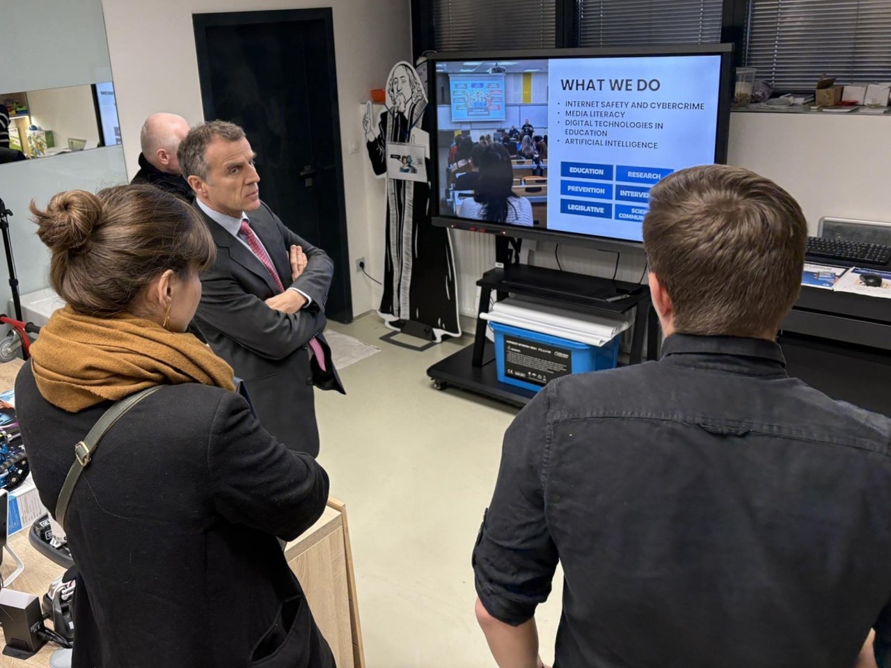 Delegace měla možnost nahlédnout přímo do zázemí laboratoří, kde probíhá výzkum i praktická výuka. Prezentovány byly nejen teoretické modely, ale i analýzy skutečných případů, které poradna E-Bezpečí denně řeší. Právě propojení akademického výzkumu s přímou pomocí obětem kyberkriminality bylo vyzdviženo jako jeden z klíčových pilířů olomouckého pracoviště.