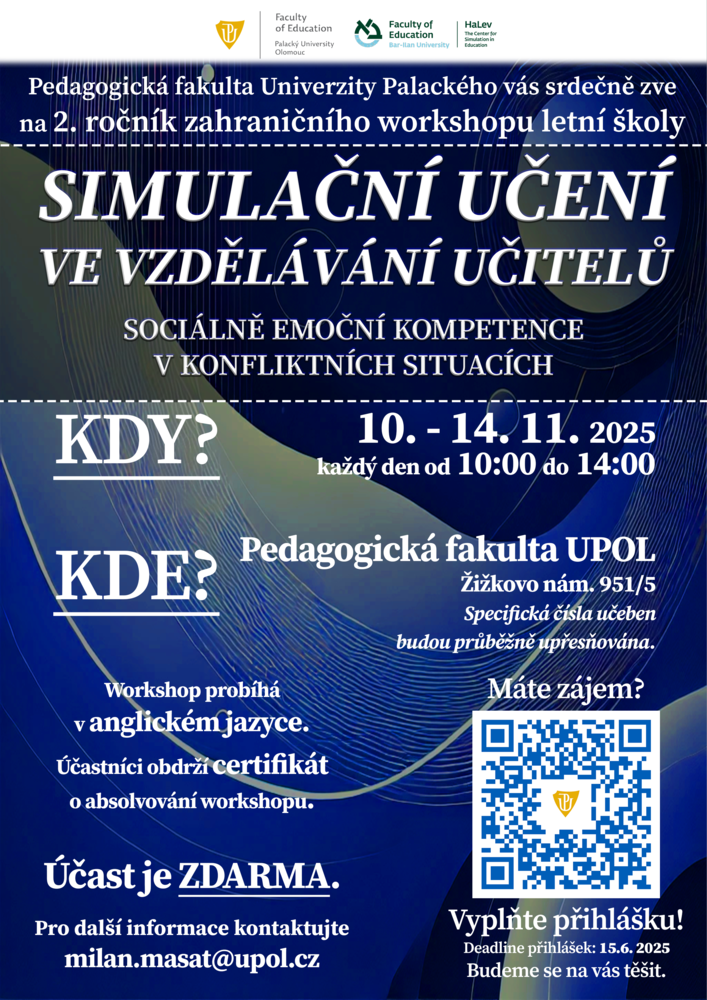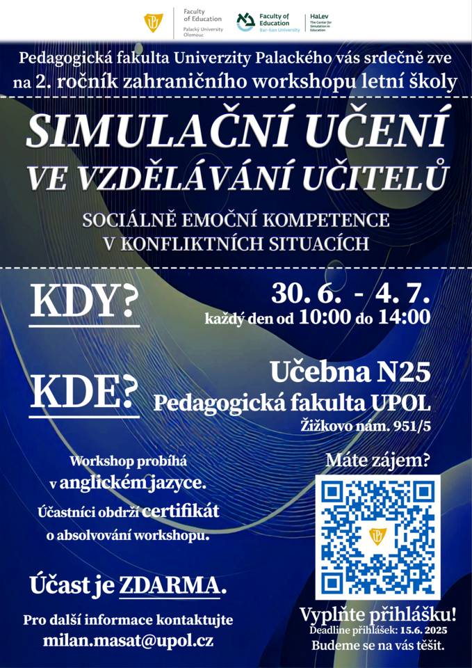 Pedagogická fakulta Univerzity Palackého v Olomouci vás srdečně zve na 2. ročník zahraničního workshopu letní školy s mezinárodní účastí: Simulační učení ve vzdělávání učitelů: Sociálně emoční kompetence v konfliktních situacích