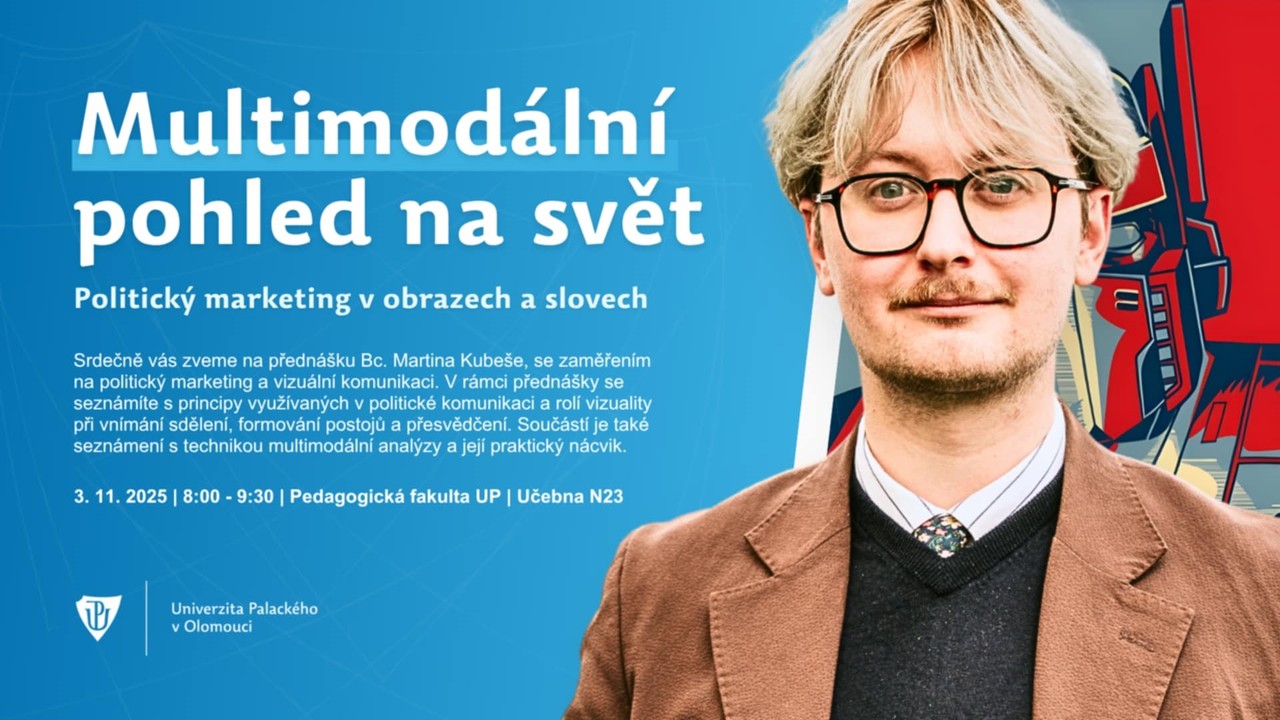 Vážené studentky, vážení studenti, společně s Bc. Martinem Kubešem Vás srdečně zveme na workshop s názvem Multimodální pohled na svět – Politický marketing v obrazech a slovech, který proběhne v pondělí 3.11.2025 od 8:00 do 9:30 v učebně N23. Zájemci, nechť se, prosím, hlásí přes tento přihlašovací formulář: https://forms.office.com/Pages/ResponsePage.aspx?id=DvLCC_8CY0ugSl-1gEPeiWgXmcJypkhFpXckN_MWKxZUOU85ME1GRlU3WklESEM3U1Y4R1U3WjE3Sy4u . Děkujeme a těšíme se na viděnou. S pozdravem: Mgr. Petra Hrdinová a Mgr. Libuše Kálová