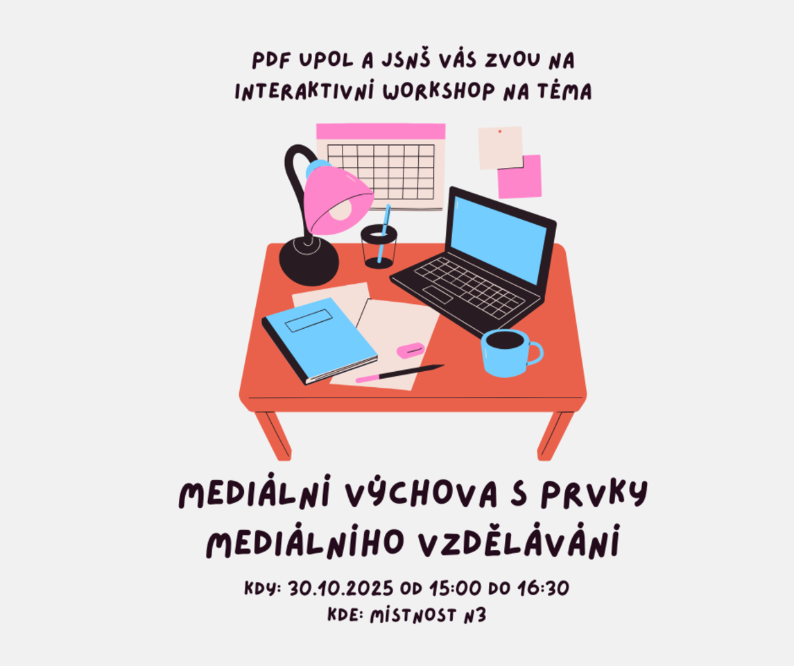 Vážené studentky, vážení studenti, společně s JSNŠ Vás srdečně zveme na workshop s názvem Mediální vzdělávání s prvky mediální výchovy, který se uskuteční ve čtvrtek 30.10.2025 od 15:00 do 16:30 v učebně N3. Zájemci, nechť se, prosím, hlásí přes tento přihlašovací formulář: