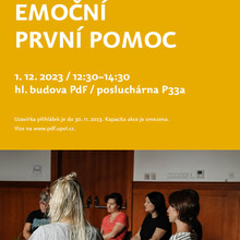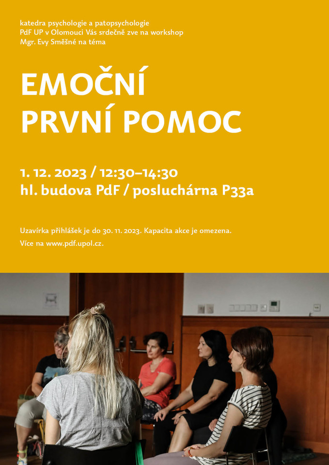 Katedra psychologie a patopsychologie PdF UP v Olomouci vás srdečně zve na workshop na téma Emoční první pomoc, který proběhne 1. prosince 2023 od 12:30 do 14:30 hodin, a to v posluchárně P33a.