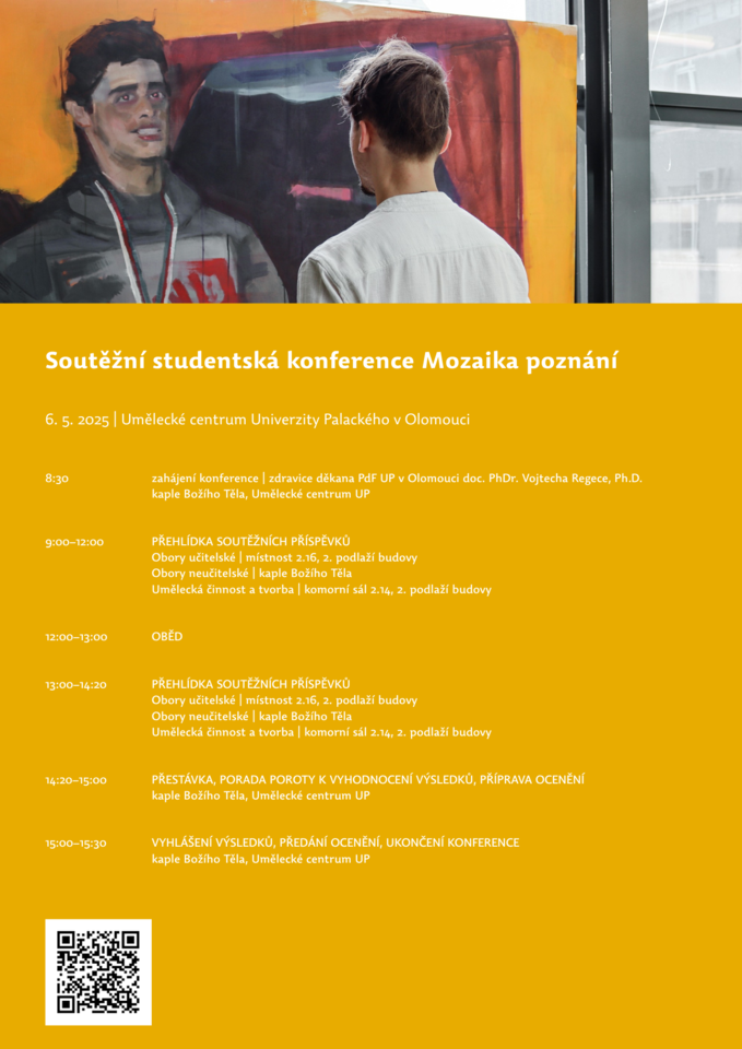 Oddělení pro vědu, výzkum a doktorská studia PdF UP připravuje na 6. května 2025 již 18. ročník studentské soutěžní konference Mozaika poznání. Konference se poprvé uskuteční v prostorách Uměleckého centra Univerzity Palackého v Olomouci a za řečnickým pultem se vystřídá na čtyři desítky studentských přednášejících.