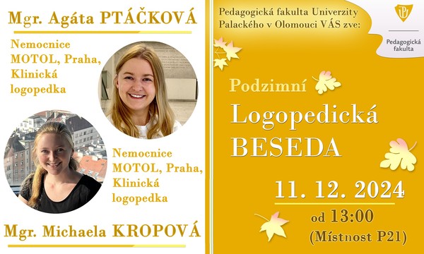 Beseda je otevřená všem zájemcům o téma, kteří by se chtěli dozvědět více. Akce letos proběhne v učebně P21 v hlavní budově Pedagogické fakulty UP na Žižkově náměstí. A těšit se můžete na skvělé hosty – přijedou hned dvě naše absolventky a současně klinické logopedky, které v současné době působí ve Fakultní nemocnici Motol v Praze.