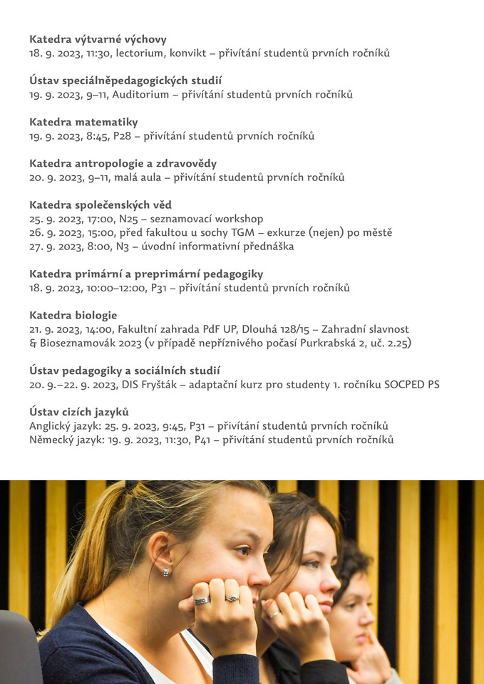 rádi bychom vás pozvali na společné setkání u příležitosti vašeho zahájení studia na Pedagogické fakultě Univerzity Palackého v Olomouci. Setkání, na němž se dozvíte důležité informace o studiu u nás, se uskuteční 18. září 2023 v 15 hodin ve velké aule na hlavní budově PdF (v přízemí). V 18:00 vás přivítá na parkánu konviktu akademická obec (Univerzitní 3–5, Olomouc). Během společenského setkání vás budou čekat zdravice zástupců akademické obce, welcome drink a seznamovací hra. Svůj set nám zahraje DJ Nicolas Vidras.