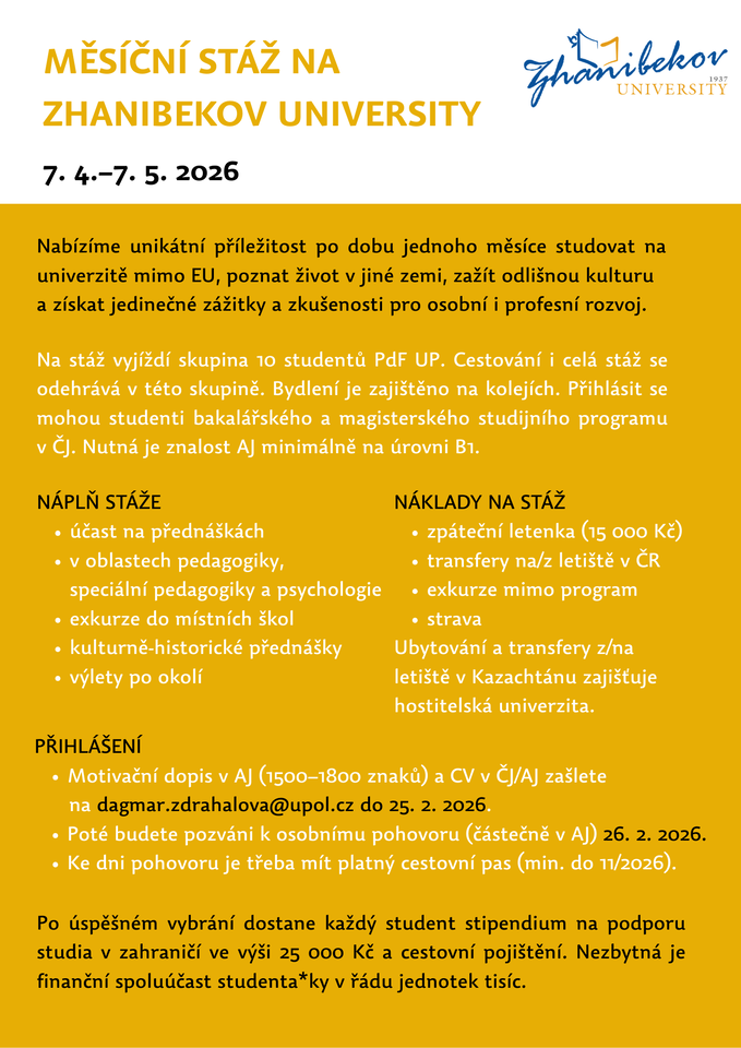 Nabízíme již tradiční měsíční stáž mimo EU v Kazachstánu na Zhanibekov University ve městě Shymkent. Termín, náplň i náležitosti přihlášky naleznete v letáčku. S případnými dotazy se obracejte na Mgr. Dagmar Zdráhalovou.