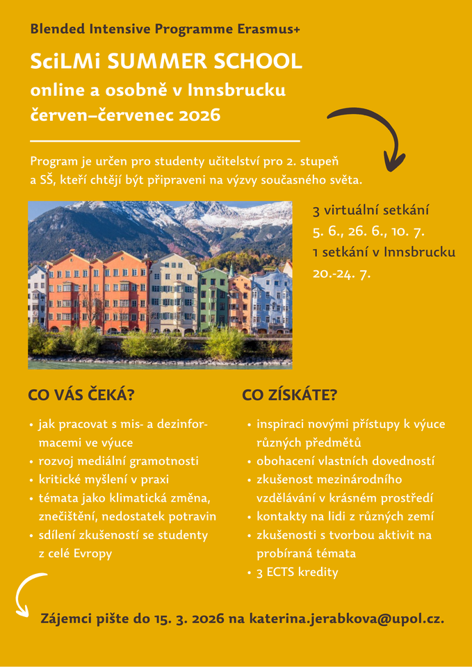 Další Blended Intensive Programme (BIP) se bude konat virtuálně již v červnu a fyzicky v červenci –tentokrát můžete strávit týden v rakouském Innsbrucku v červenci 2026. Program je určen pro studenty učitelství pro 2. stupeň ZŠ a/nebo SŠ. Můžete se hlásit do 15. 3. 2026 e-mailem dr. Kateřině Jeřábkové.