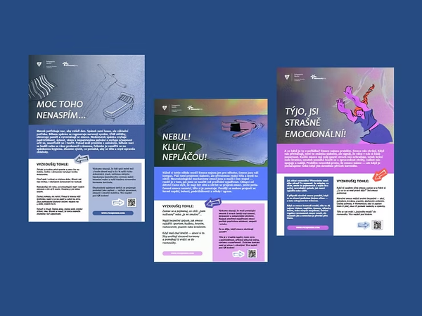 Na portálu Pečuji o sebe si můžete zdarma stáhnout kompletní plakátovou sadu ve vysokém rozlišení vhodném pro tisk. Každý plakát otevírá jedno z klíčových témat duševního zdraví — emoce, stres, úzkost, sebepoškozování, potřeby, spánek, FOMO, overthinking a další. Plakáty nejsou jen vizuálními nosiči informací. Na QR kód na každém z nich navazuje odborně podložený popularizační článek, který dané téma rozvíjí, vysvětluje a doplňuje o doporučení pro práci s mladými lidmi.